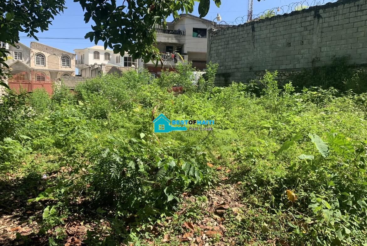 Land for sale in Thomassin 25, prolonge, Petion-Ville, Haiti. Terrain is measures at 1,354 square meters or 10.5 centiemes, two-sided fence, flat, ready to build. Sold by owner, the land is tucked by a residential road for quick entrance and exit.