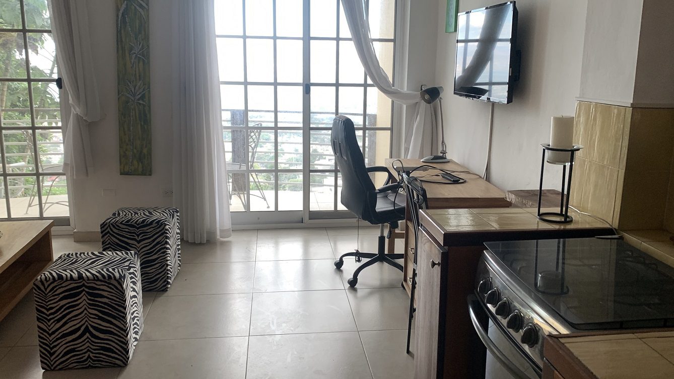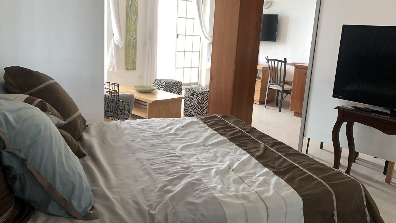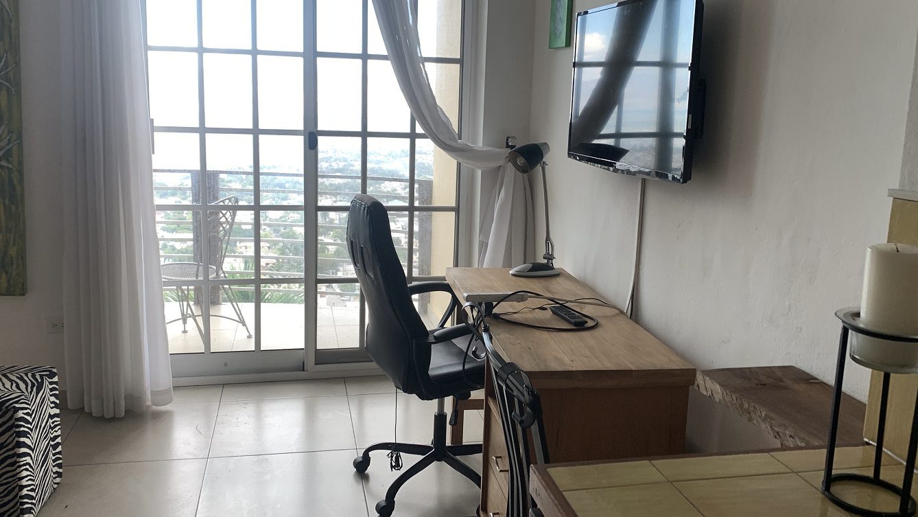 Luxury furnished studio apartment for rent in Morne Calvaire, Petion-Ville, Haiti. Located in the lower upscale part of the mountainous city, the spacious, modern, and luxurious flat INCLUDES EVERYTHING: 24/7 electricity, air conditioner units (A/C), Wi-Fi Internet, cable television (TV), heater, and office area.